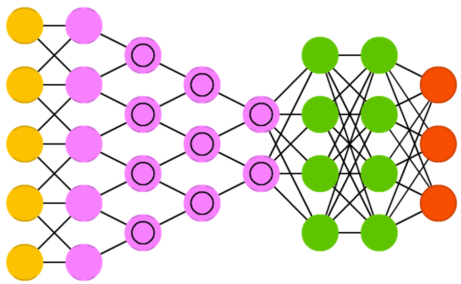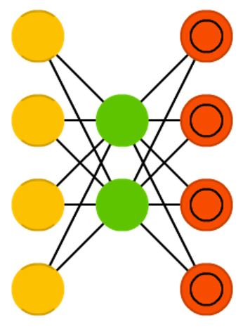 Autoencoders: encode (compress) information automatically. Everything up to the middle is called the encoding part, everything after the middle the decoding and the middle the code.