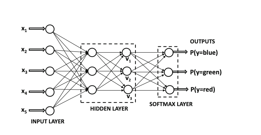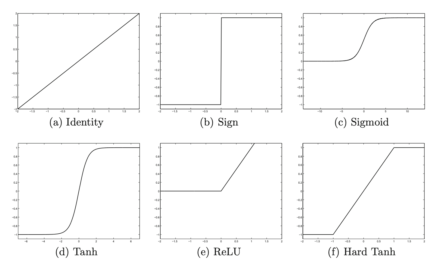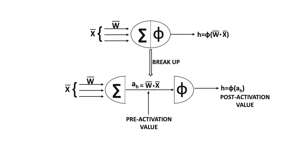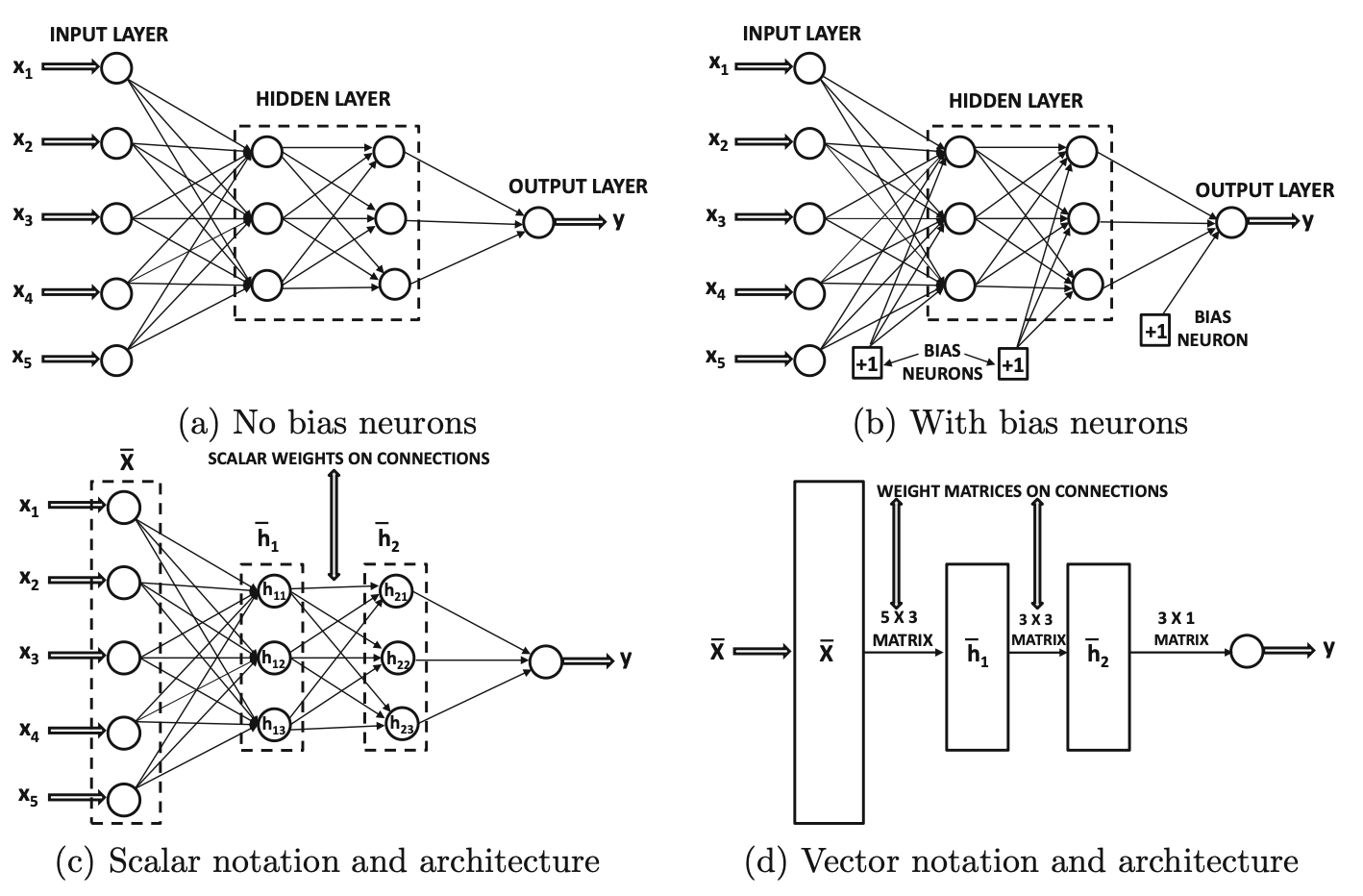 Therefore, a \(d\)-dimensional input vector \(\overline{x}\) is transformed into the outputs using these equations: \[\begin{align*} &\overline{h}_1 = \Phi(W_1^T x),\\ &\overline{h}_{p+1} = \Phi(W_{p+1}^T \overline{h}_p), \forall p \in \left\{1 \dots k-1 \right\} \\ &\overline{o} = \Phi(W_{k+1}^T \overline{h}_k) \end{align*}\] Activation functions operate on vectors and are applied element-wise.