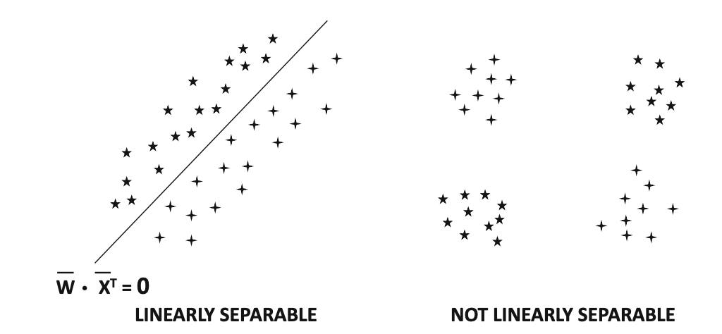 In linearly separable data sets, a nonzero weight vector \(W\) exists in which the \(sign(\overline{W}^T X) = sign(y_i)\; \forall (\overline{X}_i,y_i)\).