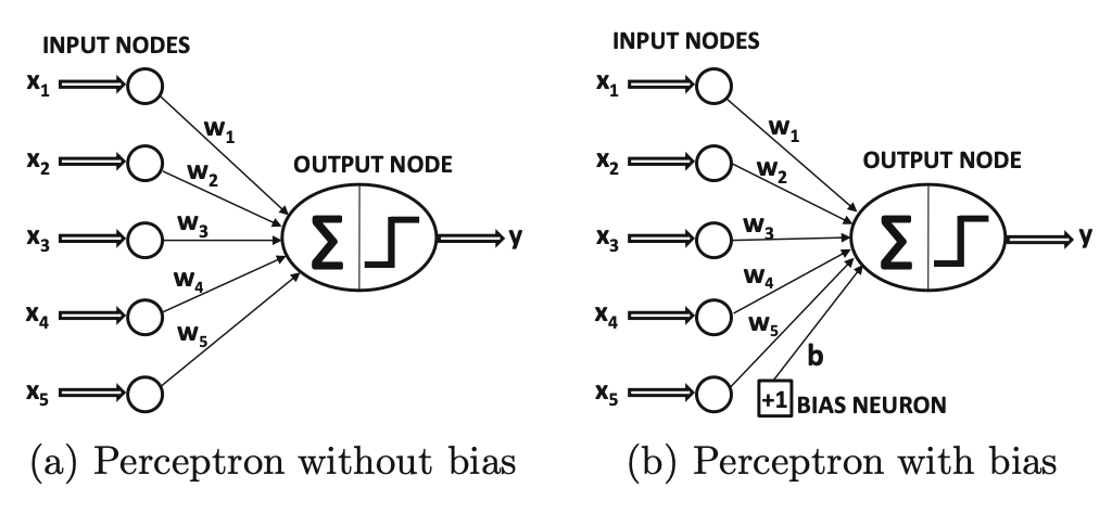 Bias is needed when binary class distribution is imbalanced: \[ \overline{W}^T \cdot \sum_i \overline{X_i}^T \neq \sum_i y_i \] Bias can be incorporated by using a bias neuron.