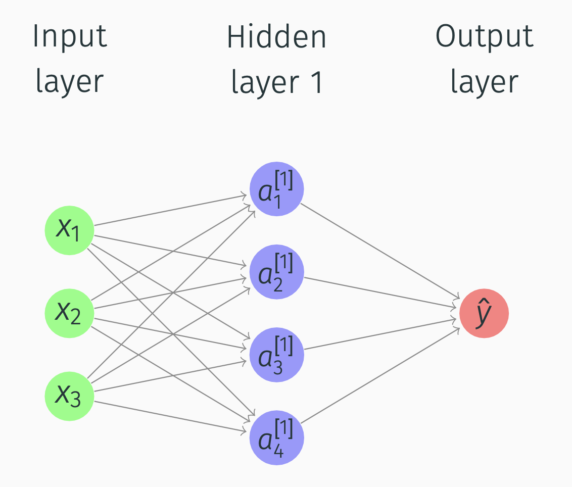 Alternative notation: \(a^{[0]} = x\). So in the picture \[\begin{align*} a = \begin{bmatrix} a_1^{[1]} \\ a_2^{[1]}\\ a_3^{[1]}\\ a_4^{[1]} \end{bmatrix} \end{align*}\] 2-layer network (input layer not counted). Input layer is layer 0.