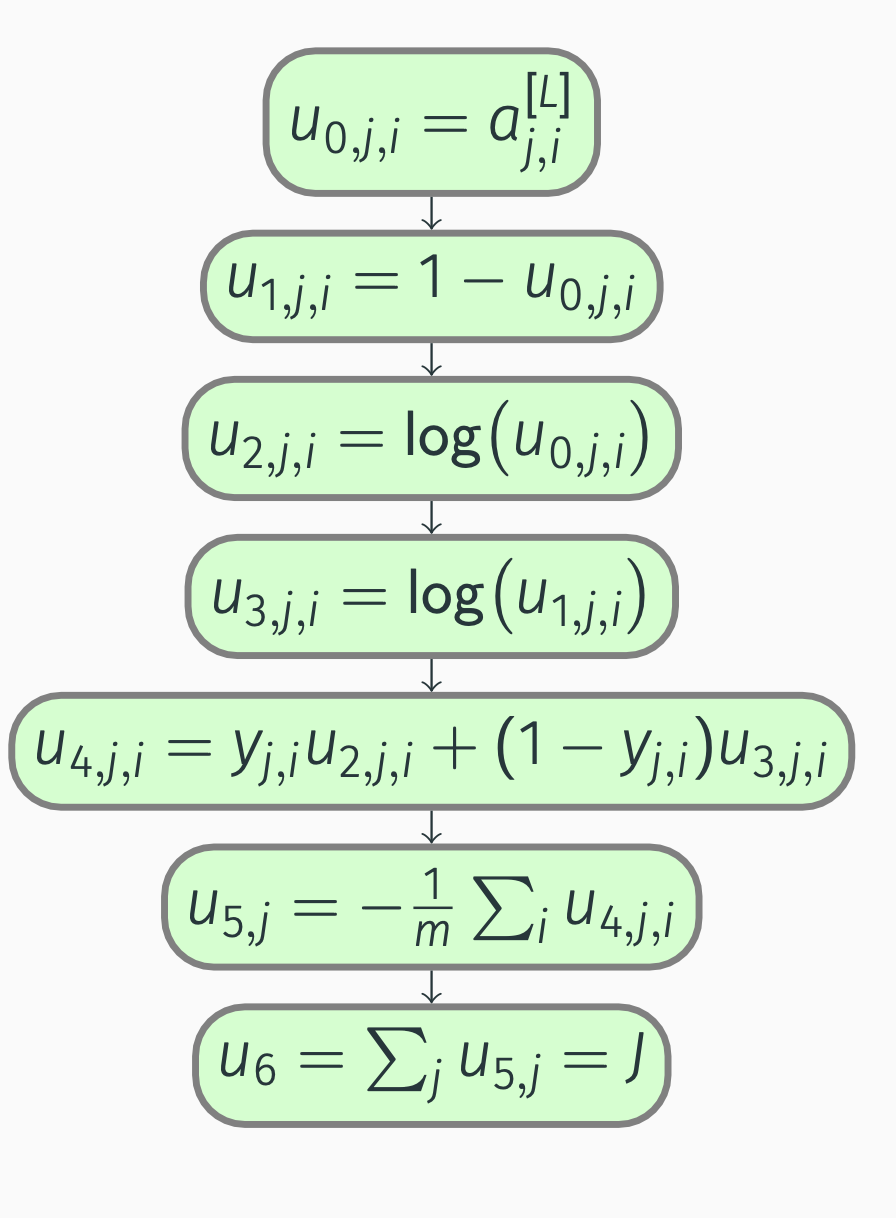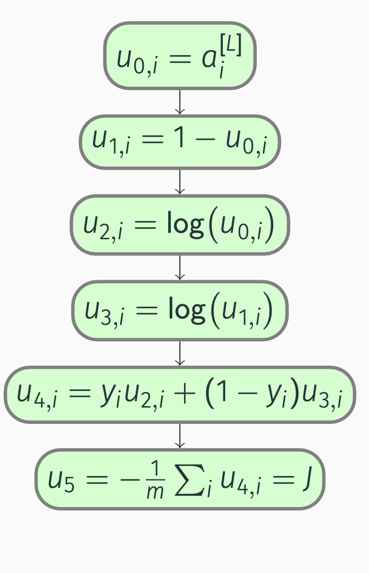 \[\begin{align*} \pdv{J}{u_5} &= 1, \; \pdv{J}{u_{4, i}} = \pdv{J}{u_5} \pdv{u_5}{u_{4, i}} = -\frac{1}{m}, \\ \pdv{J}{u_{3, i}} &= \pdv{J}{u_{4, i}} \pdv{u_{4, i}}{u_{3, i}} = -\frac{1}{m} (1 - y_i), \\ \pdv{J}{u_{2, i}} &= \pdv{J}{u_{4, i}} \pdv{u_{4, i}}{u_{2, i}} = -\frac{1}{m} y_i, \\ \pdv{J}{u_{1, i}} &= \pdv{J}{u_{3, i}} \pdv{u_{3, i}}{u_{1, i}} = -\frac{1}{m} (1 - y_i) \frac{1}{u_{1, i}} = -\frac{1}{m} \frac{1 - y_i}{1 - a_i^{[L]}}, \\ \pdv{J}{u_{0, i}} &= \pdv{J}{u_{1, i}} \pdv{u_{1, i}}{u_{0, i}} + \pdv{J}{u_{2, i}} \pdv{u_{2, i}}{u_{0, i}} = \frac{1}{m} (1 - y_i) \frac{1}{u_{1, i}} - \frac{1}{m} y_i \frac{1}{u_{0, i}} = \\ &=\frac{1}{m} \Bigl(\frac{1 - y_i}{1 - a_i^{[L]}} - \frac{y_i}{a_i^{[L]}}\Bigr). \notag \end{align*}\]