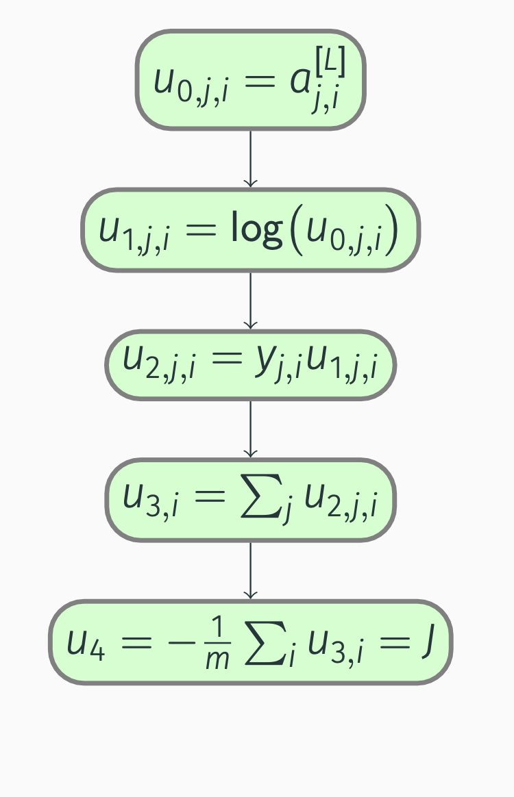 \[\begin{align*} \pdv{J}{u_4} &= 1, \\ \pdv{J}{u_{3, i}} &= \pdv{J}{u_4} \pdv{u_4}{u_{3, i}} = -\frac{1}{m}, \\ \pdv{J}{u_{2, j, i}} &= \pdv{J}{u_{3, i}} \pdv{u_{3, i}}{u_{2, j, i}} = -\frac{1}{m}, \\ \pdv{J}{u_{1, j, i}} &= \pdv{J}{u_{2, j, i}} \pdv{u_{2, j, i}}{u_{1, j, i}} = -\frac{1}{m} y_{j, i}, \\ \pdv{J}{u_{0, j, i}} &= \pdv{J}{u_{1, j, i}} \pdv{u_{1, j, i}}{u_{0, j, i}} = -\frac{1}{m} y_{j, i} \frac{1}{u_{0, j, i}} = -\frac{1}{m} \frac{y_{j, i}}{a_{j, i}^{[L]}}. \end{align*}\]