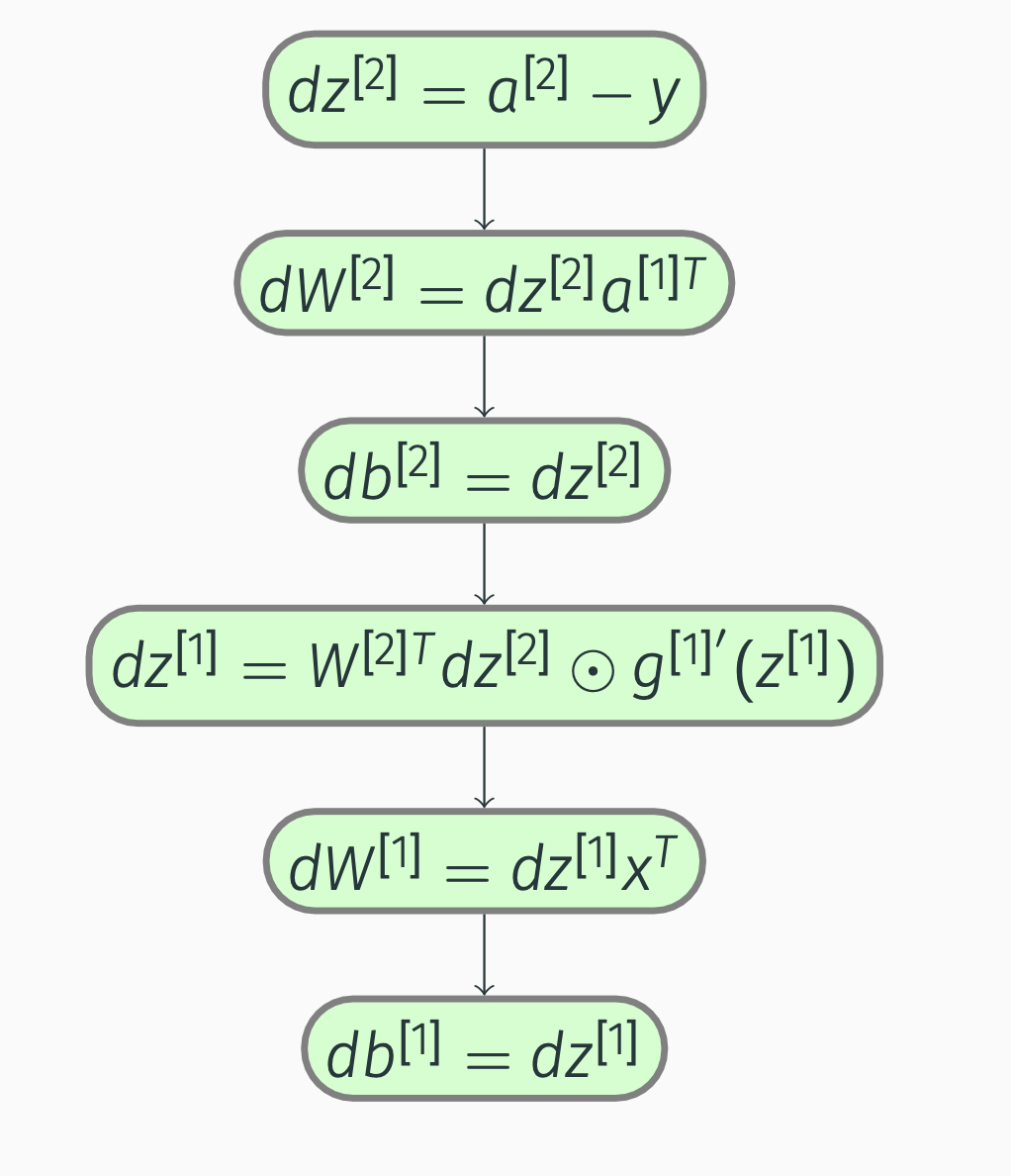 Next step: \[\begin{align*} &dZ^{[1]} = W^{[2]T}dZ^{[2]} \odot g^{[1]'}(Z^{[1]}),\\ &dW^{[1]} = \frac{1}{m}dZ^{[1]}X^{T},\\ &dB^{[1]} = \frac{1}{m}np.sum(dZ^{[1]}, axis=1, keepdims=True) \end{align*}\]