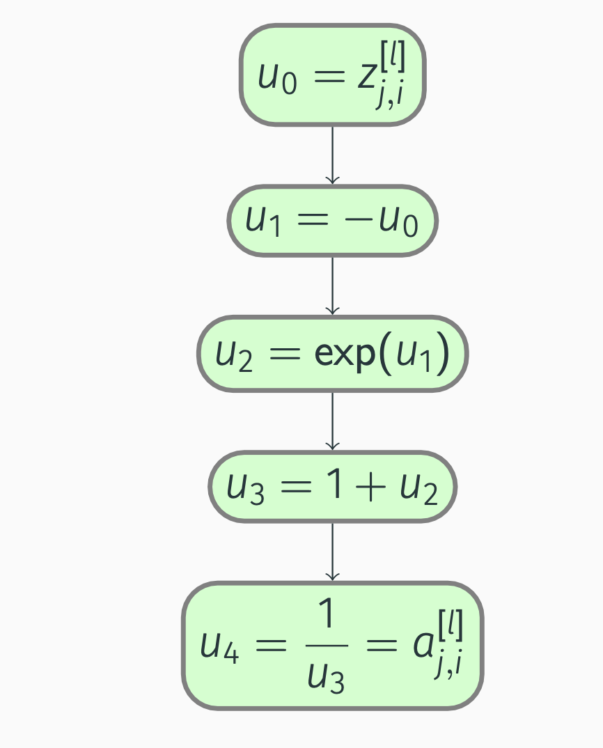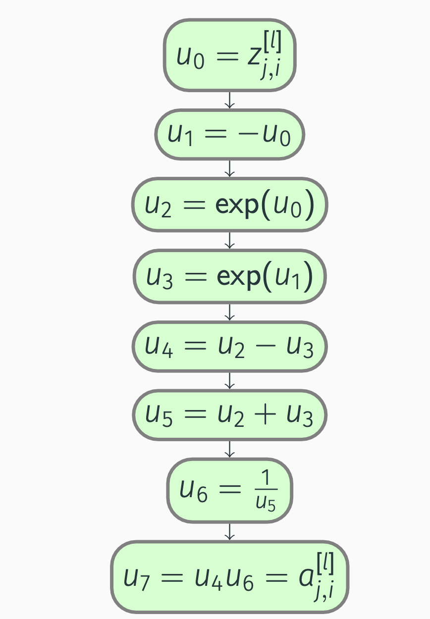 \[\begin{align*} u_{-1} &= z_{j, i}^{[l]}, \\ u_{0, p} &= z_{p, i}^{[l]}, &&\forall p \ne j, \\ u_1 &= \exp(u_{-1}), \\ u_{2, p} &= \exp(u_{0, p}), &&\forall p \ne j, \\ u_3 &= u_1 + \sum_{p \ne j} u_{2, p}, \\ u_4 &= \frac{1}{u_3}, \\ u_5 &= u_{2, p} u_4 = a_{p, i}^{[l]}, &&\forall p \ne j. \end{align*}\]