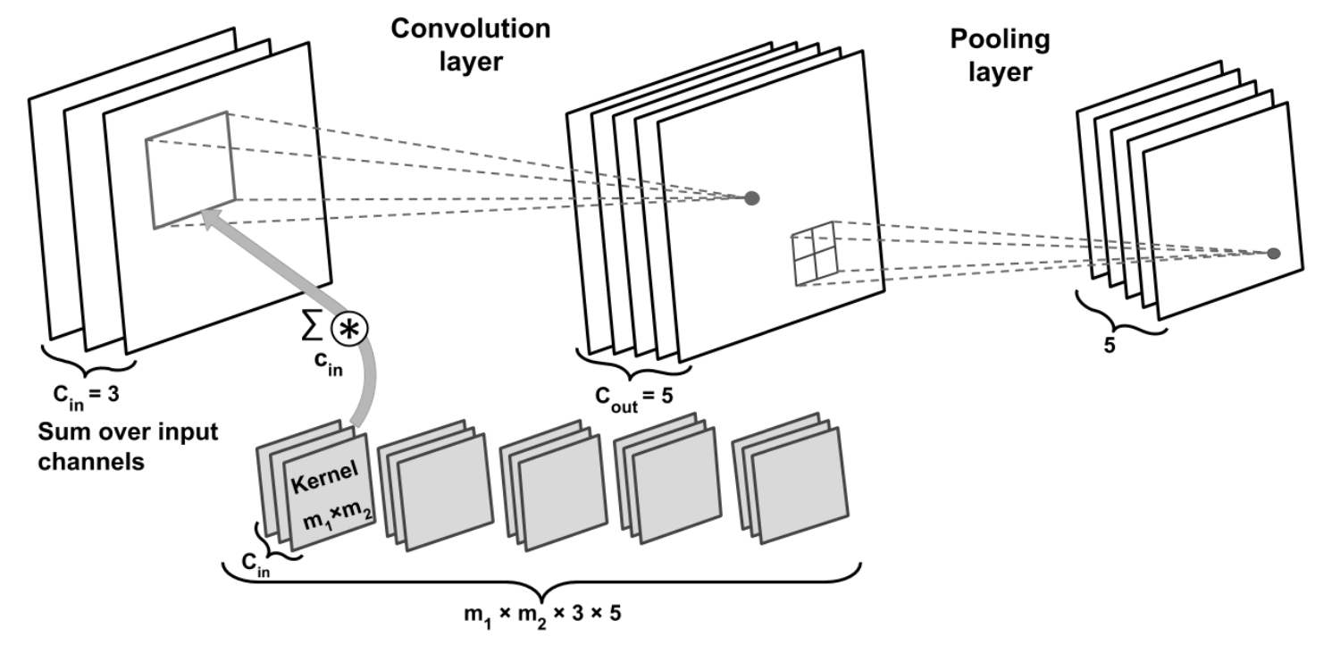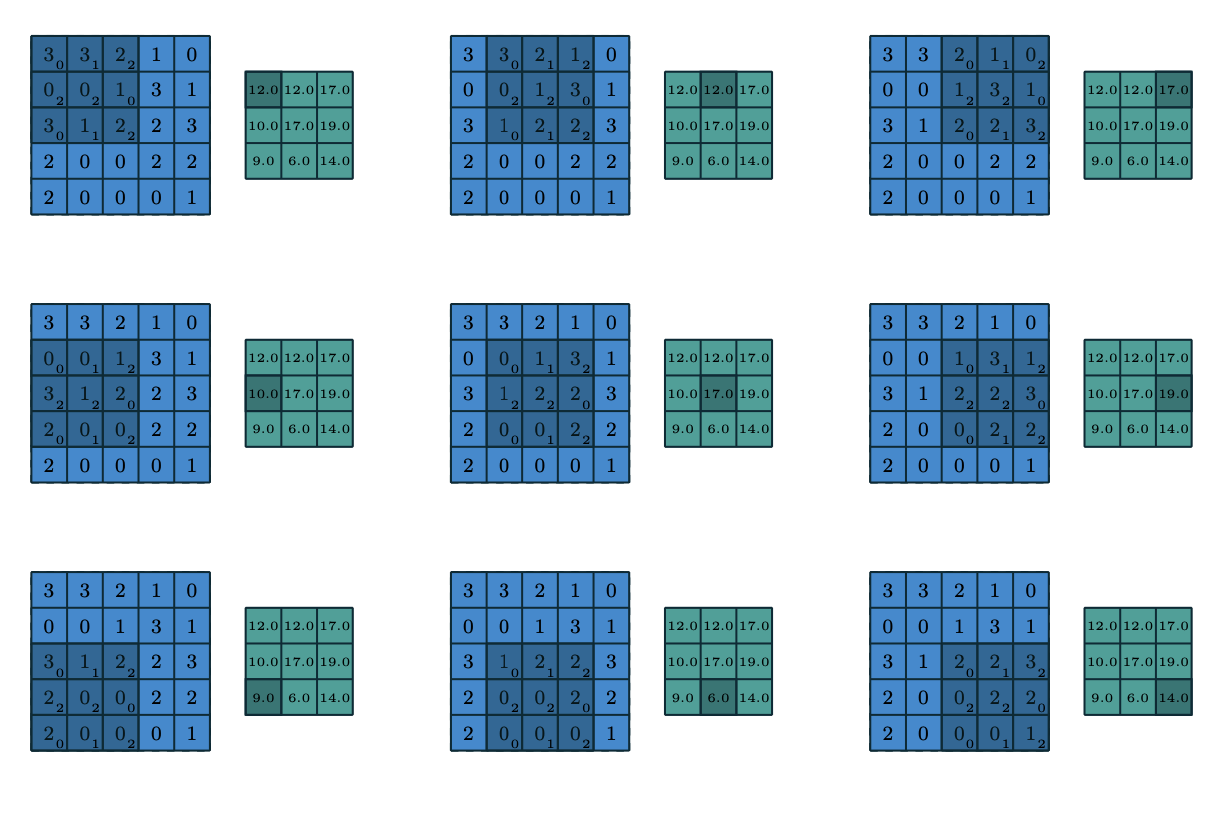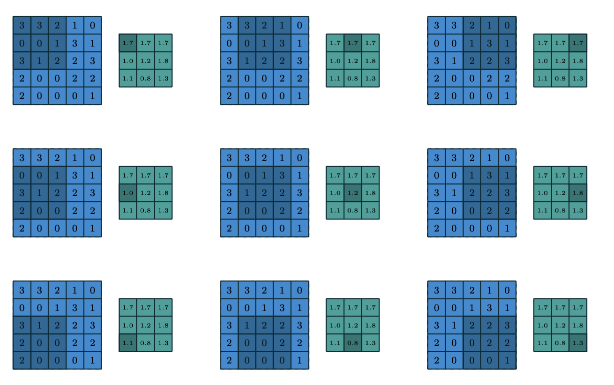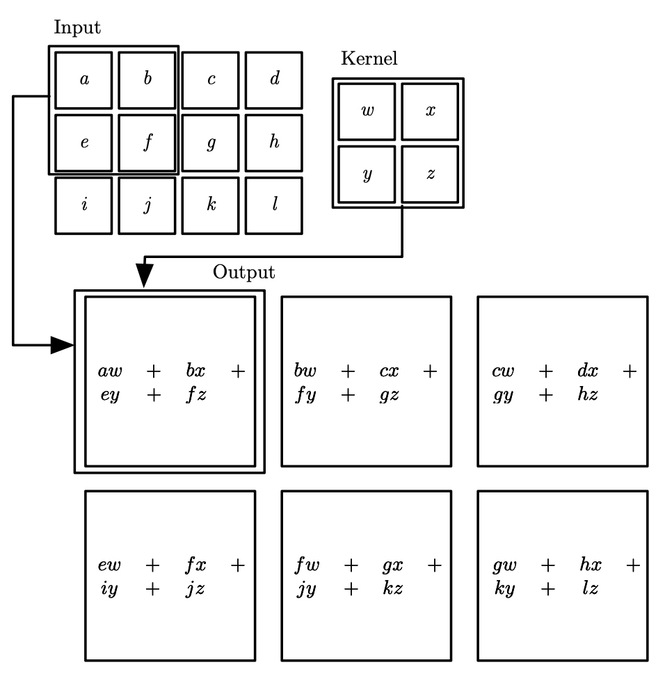 \[ S(i, j) = (I \ast K)(i,j) = \sum\limits_m \sum\limits_n I(i+m,j+n)K(m,n) \]