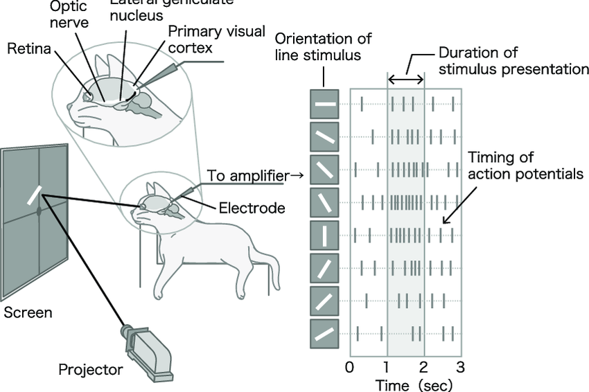 They measured the electrical responses of individual neurons in the visual cortex of cats while presenting visual stimuli to the cats’ eyes.