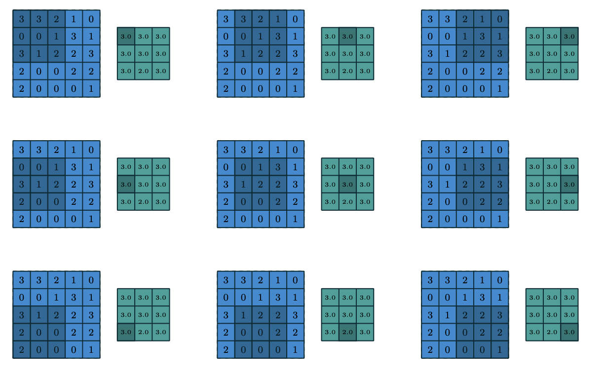 Stride: 1 pixel, width: 3 pixels. Bottom row: shifted right.