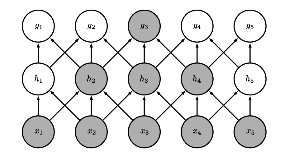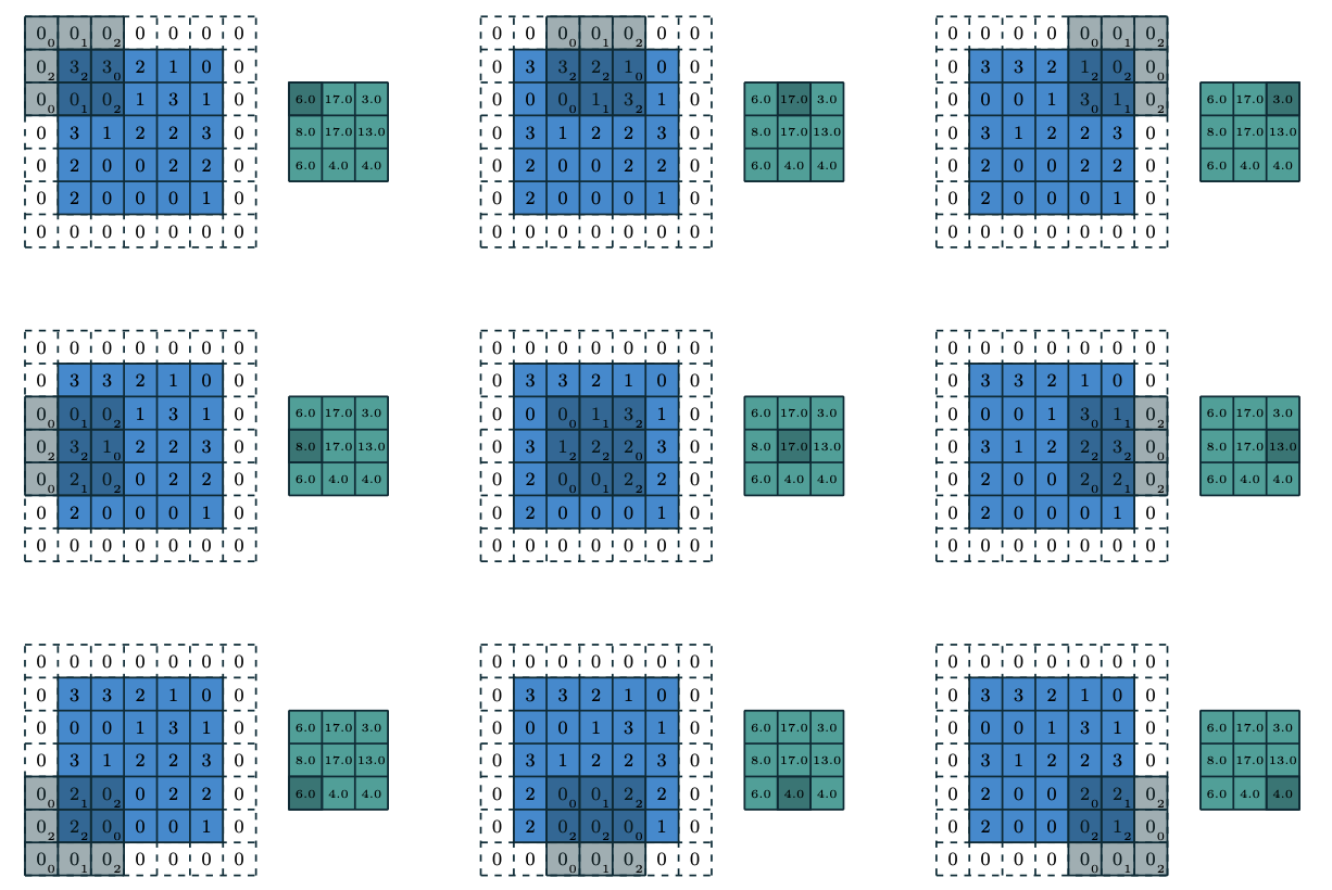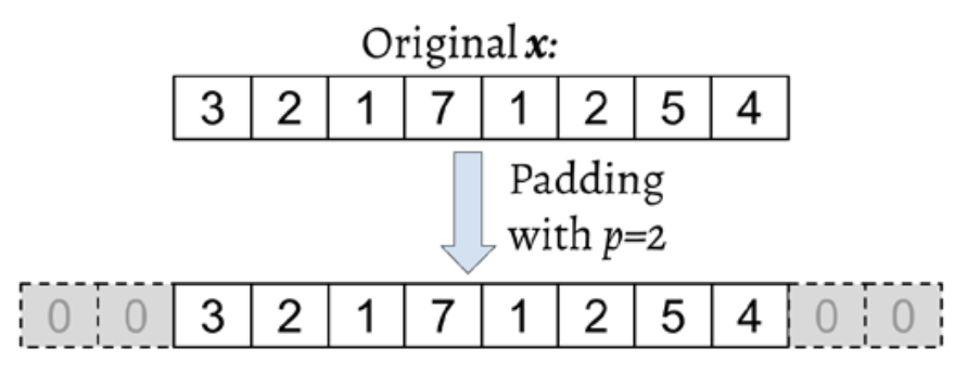 Padding with size \(p\), input size \(n\) and filter size \(m\), \(m \leq n\): \[ \begin{gather} y[i] = \sum\limits_{k=0}^{m-1} x^p [i+m-k]w[k] \end{gather} \]