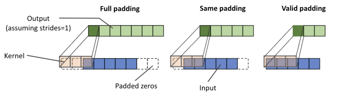 There are three modes of padding that are commonly used in practice: full, same, and valid.