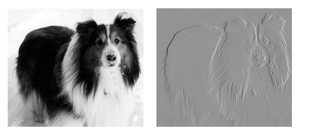 Efficiency of edge detection.The image on the right was formed by taking each pixel in the original image and subtracting the value of its neighboring pixel on the left.