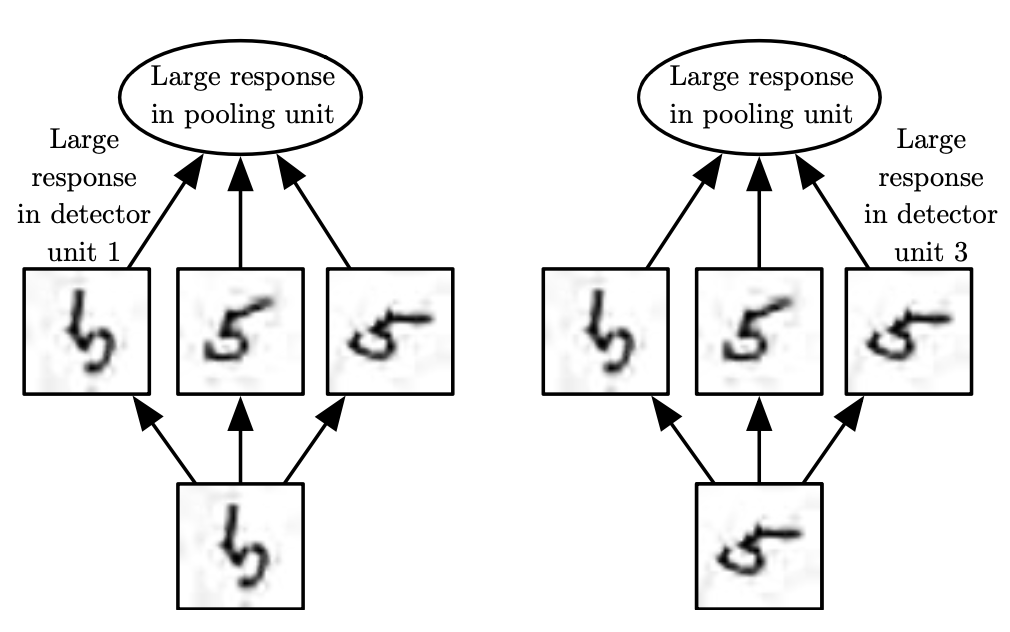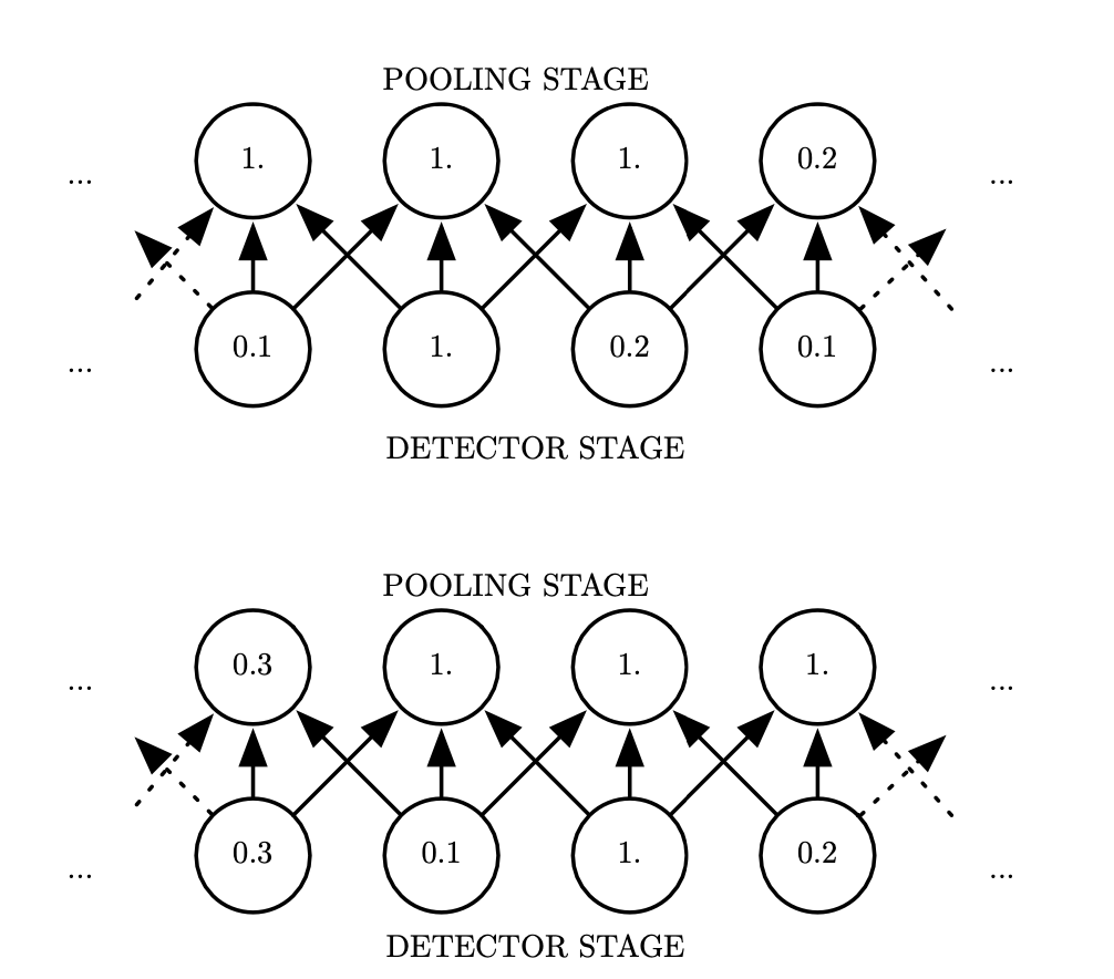 Invariance to translation means that if we translate the input by a small amount, the values of most of the pooled outputs do not change.