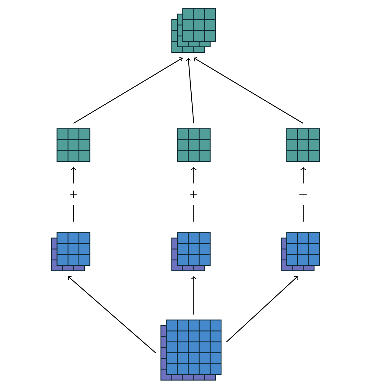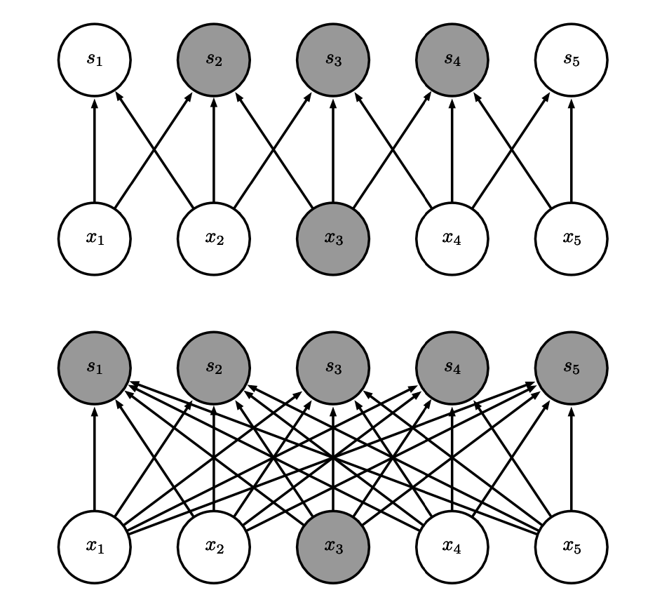 Number of parameters for a CNN: \(m_1 \times m_2 \times 3 \times 5 + 5\). Number of parameters for a fully-connected NN: \((n_1 \times n_2 \times 3) \times (n_1 \times n_2 \times 5)\).